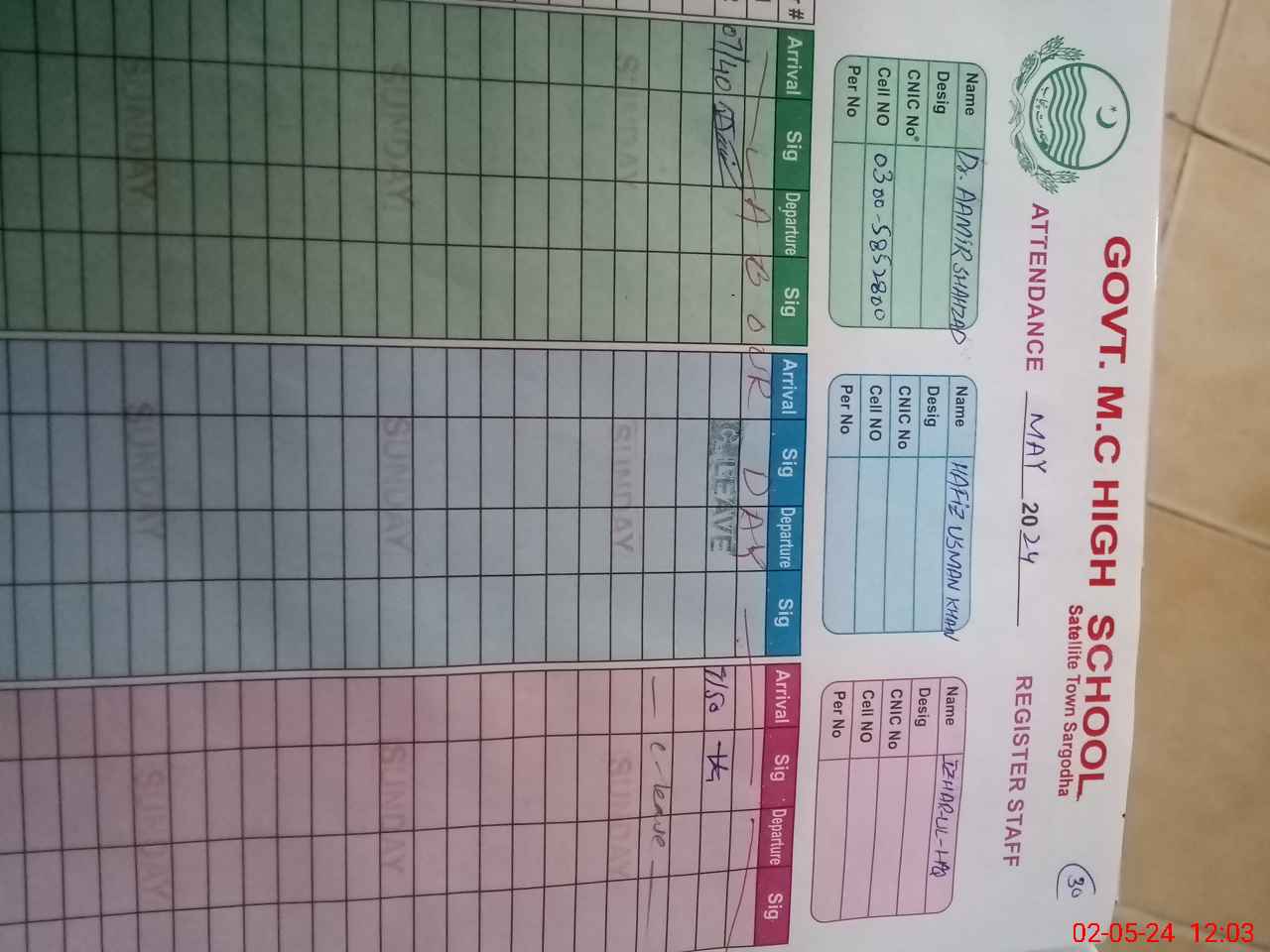 | CNIC | Full Name | Designation | R/C | Absence During Last Calender Month |