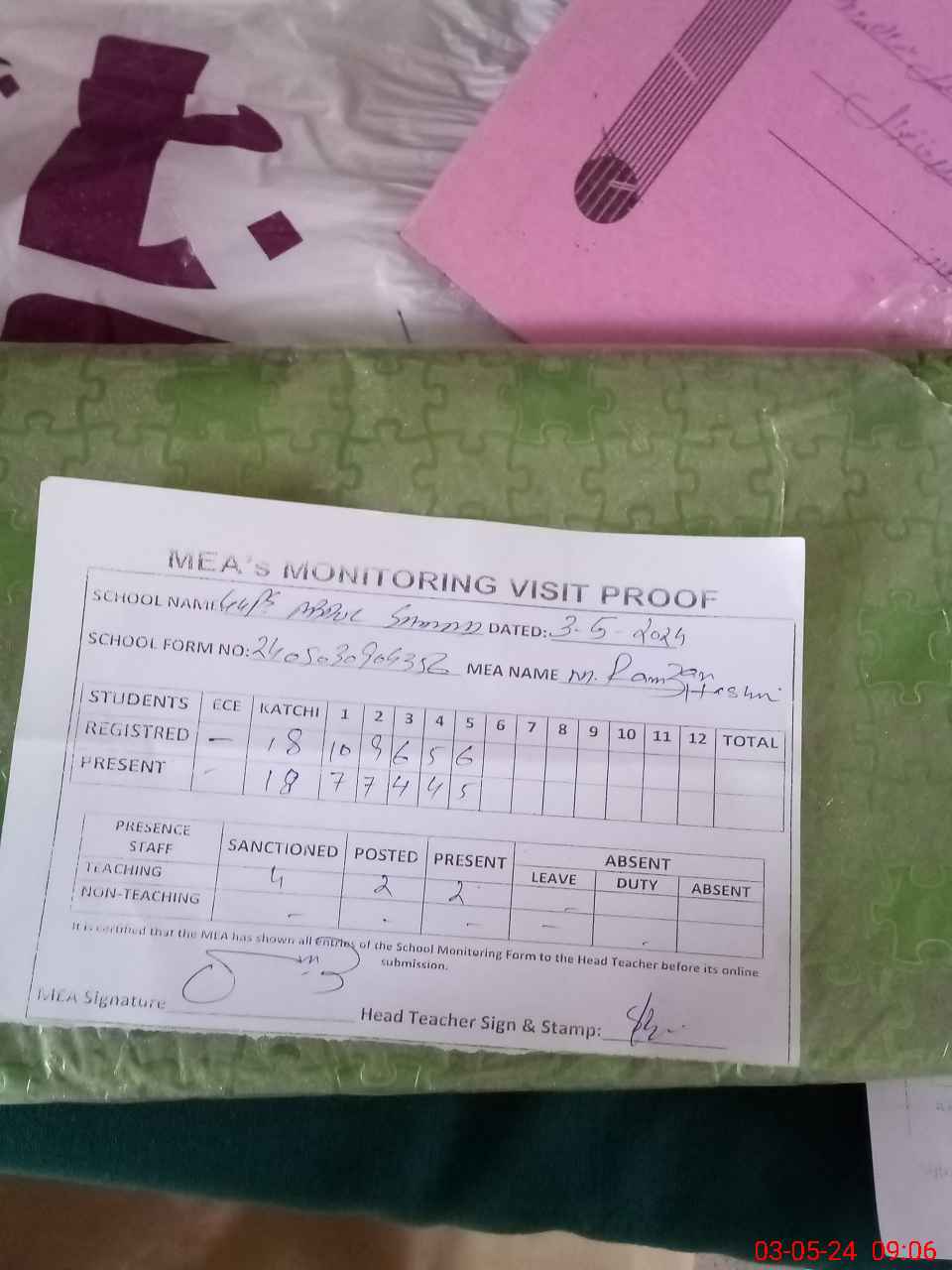 | Attendance Register | Head Teacher | MEA with School | Visit Proof |