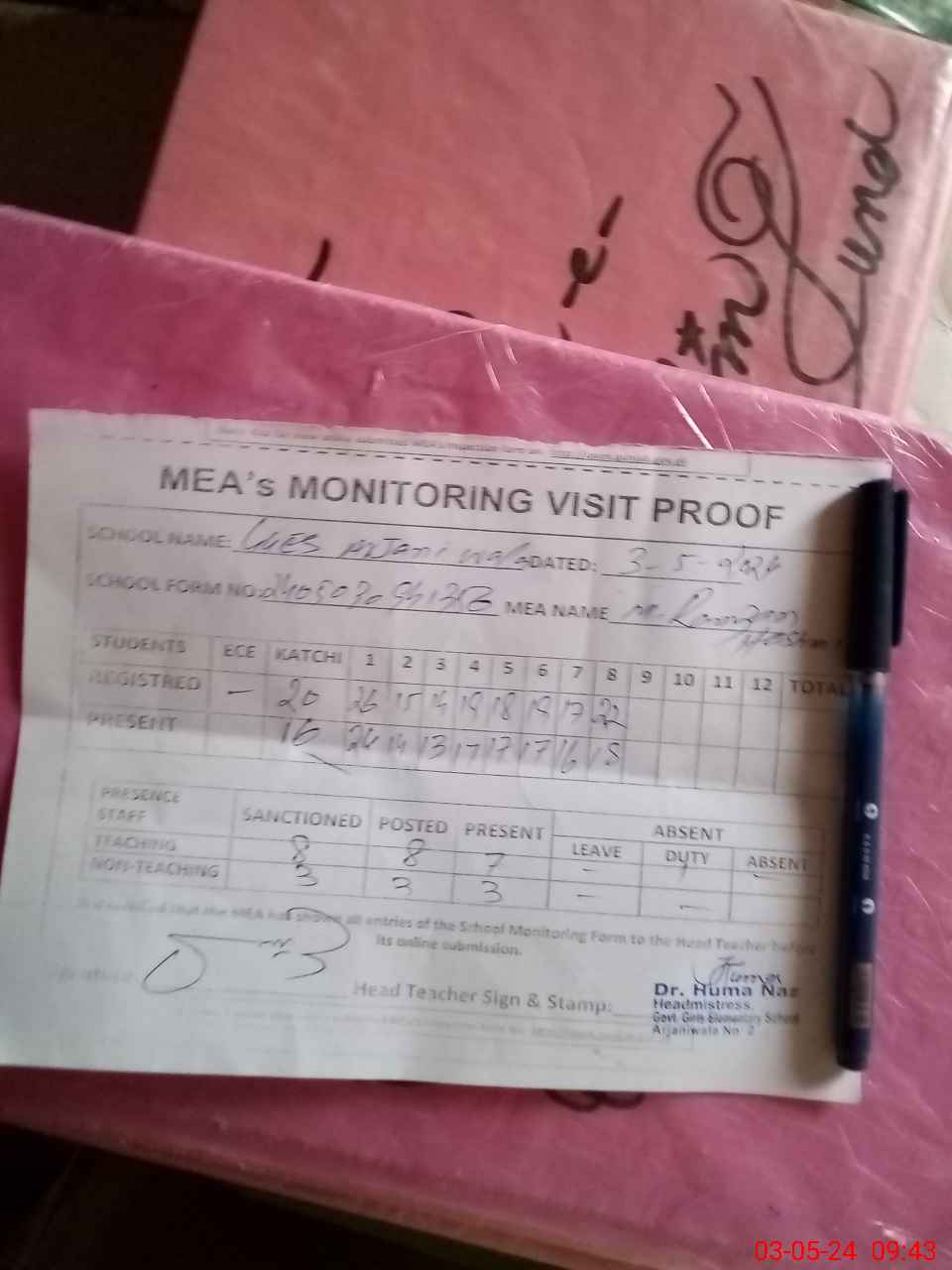 | Attendance Register | Head Teacher | MEA with School | Visit Proof |