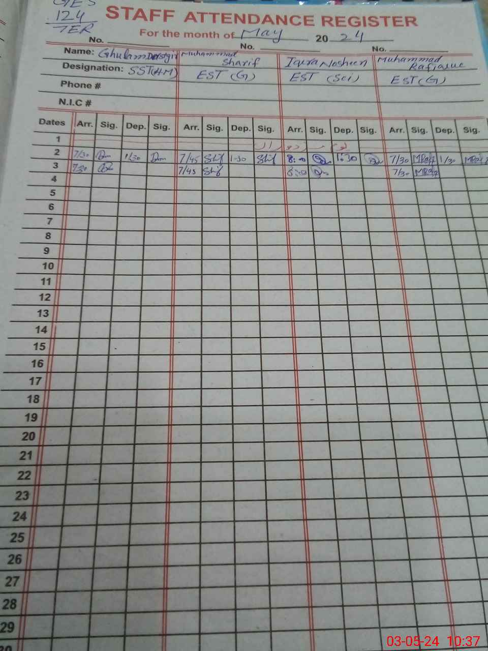 | CNIC | Full Name | Designation | R/C | Absence During Last Calender Month |