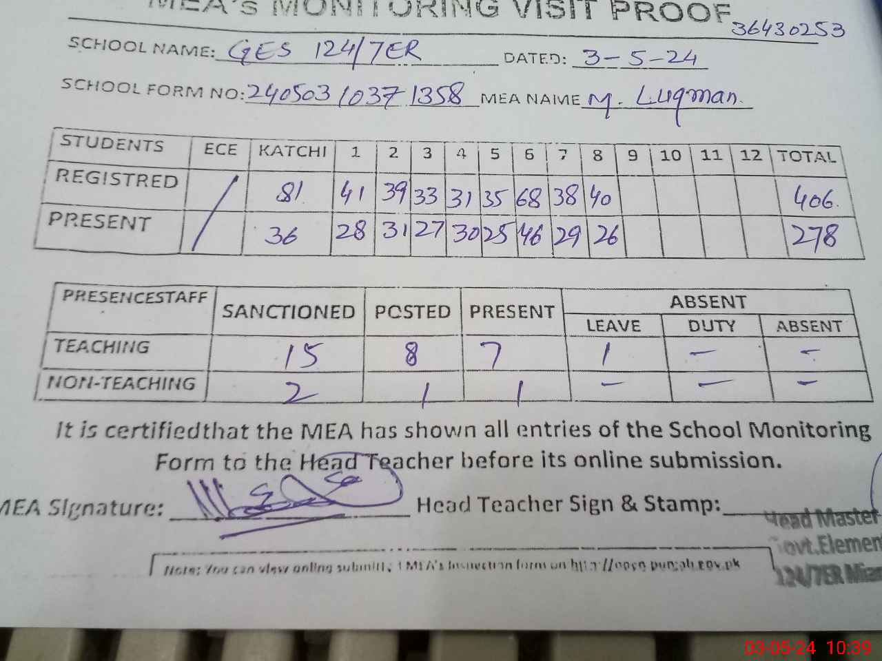 | Attendance Register | Head Teacher | MEA with School | Visit Proof |