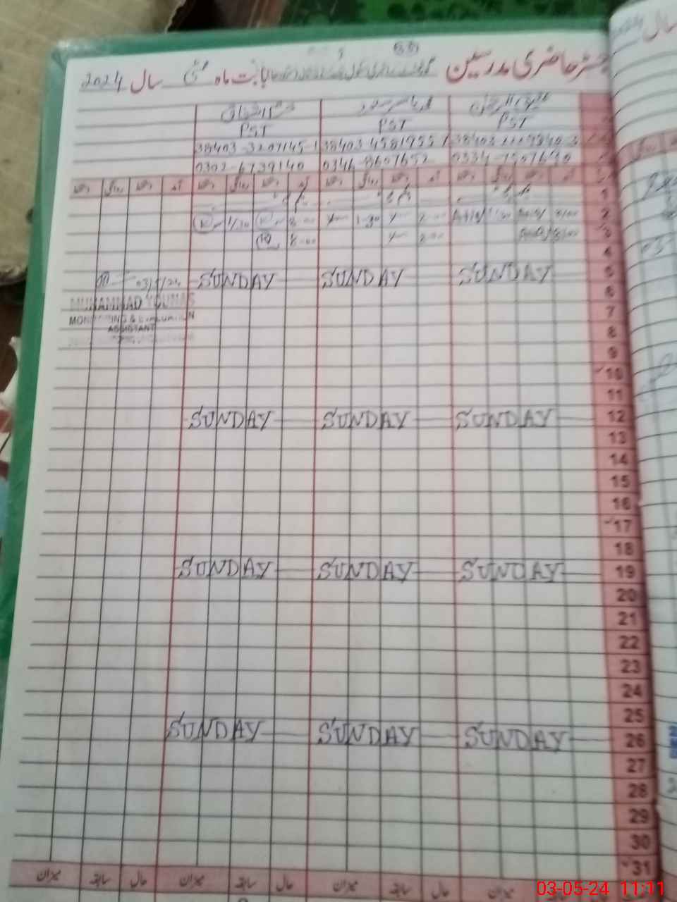 | CNIC | Full Name | Designation | R/C | Absence During Last Calender Month |