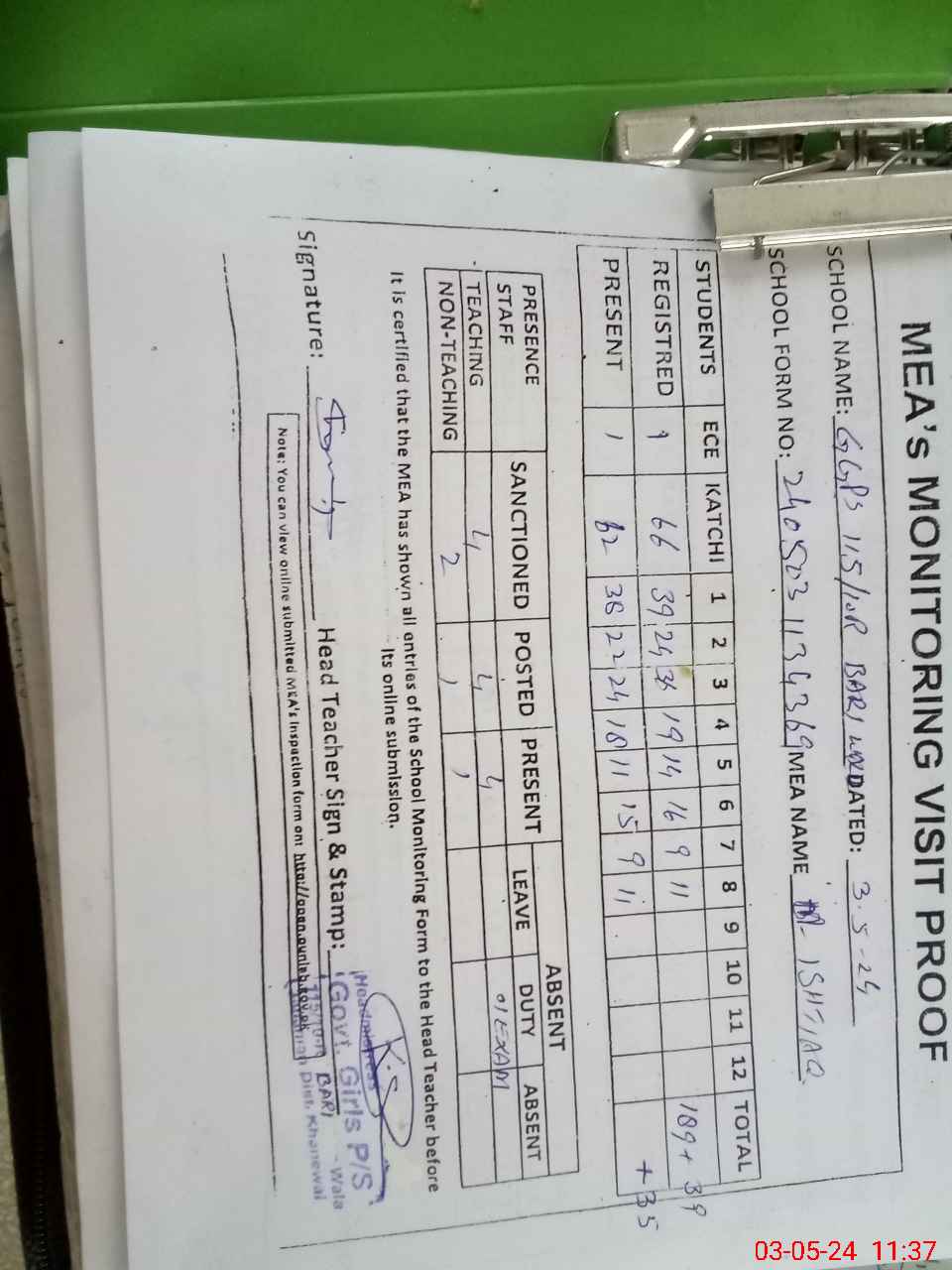 | Certified that this School was Inspected by the Undersigned MEA/DMO Today and the Information Stated Above is as Per Record. | |||||