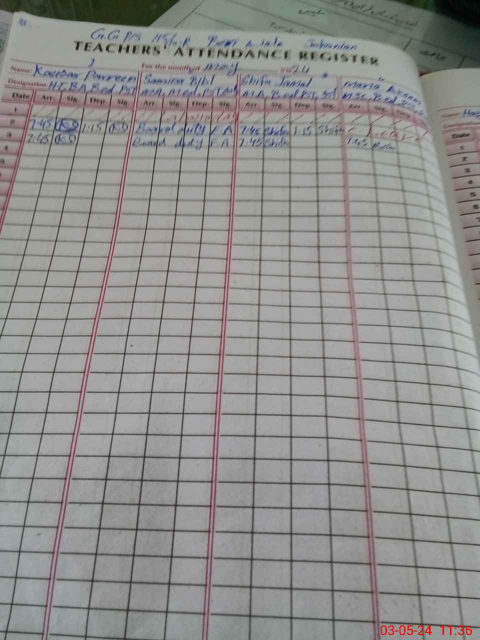 | 36**** | Sa**** Bi**** | 1 | 1 | 0 | 0 | 0 | 0 | 0 | 0 | 0 | 0 | 0 | Exam Duty |