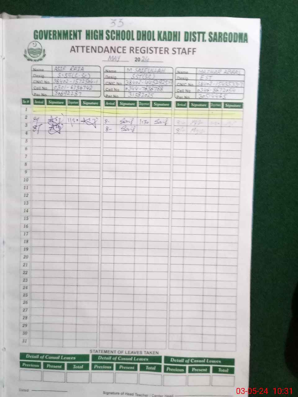 | CNIC | Full Name | Designation | R/C | Absence During Last Calender Month |