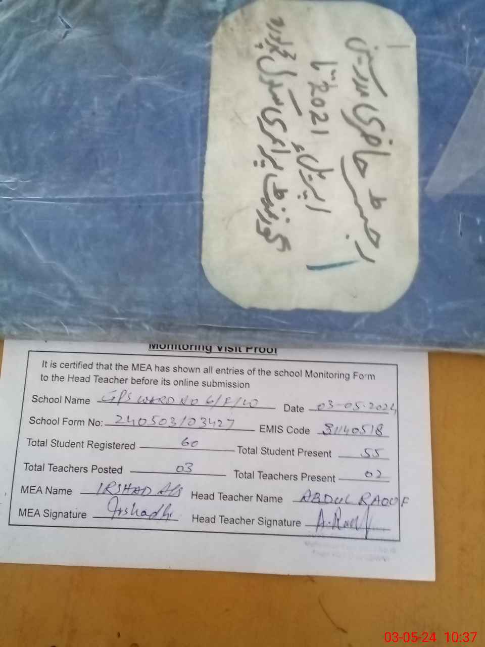 | Attendance Register | Head Teacher | MEA with School | Visit Proof |