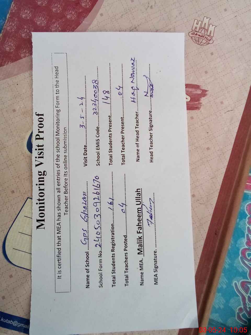 | Attendance Register | Head Teacher | MEA with School | Visit Proof |