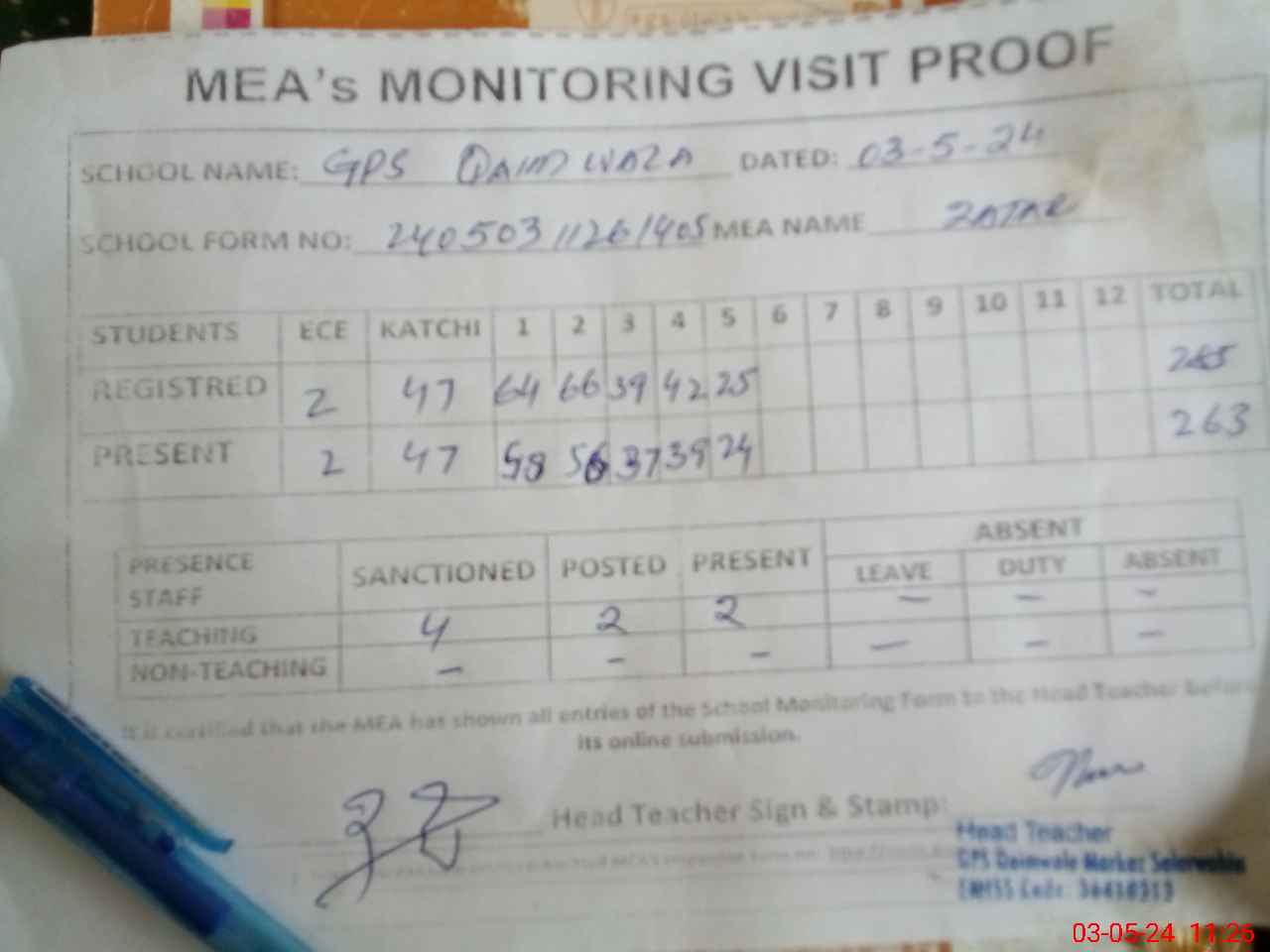 | Attendance Register | Head Teacher | MEA with School | Visit Proof |
