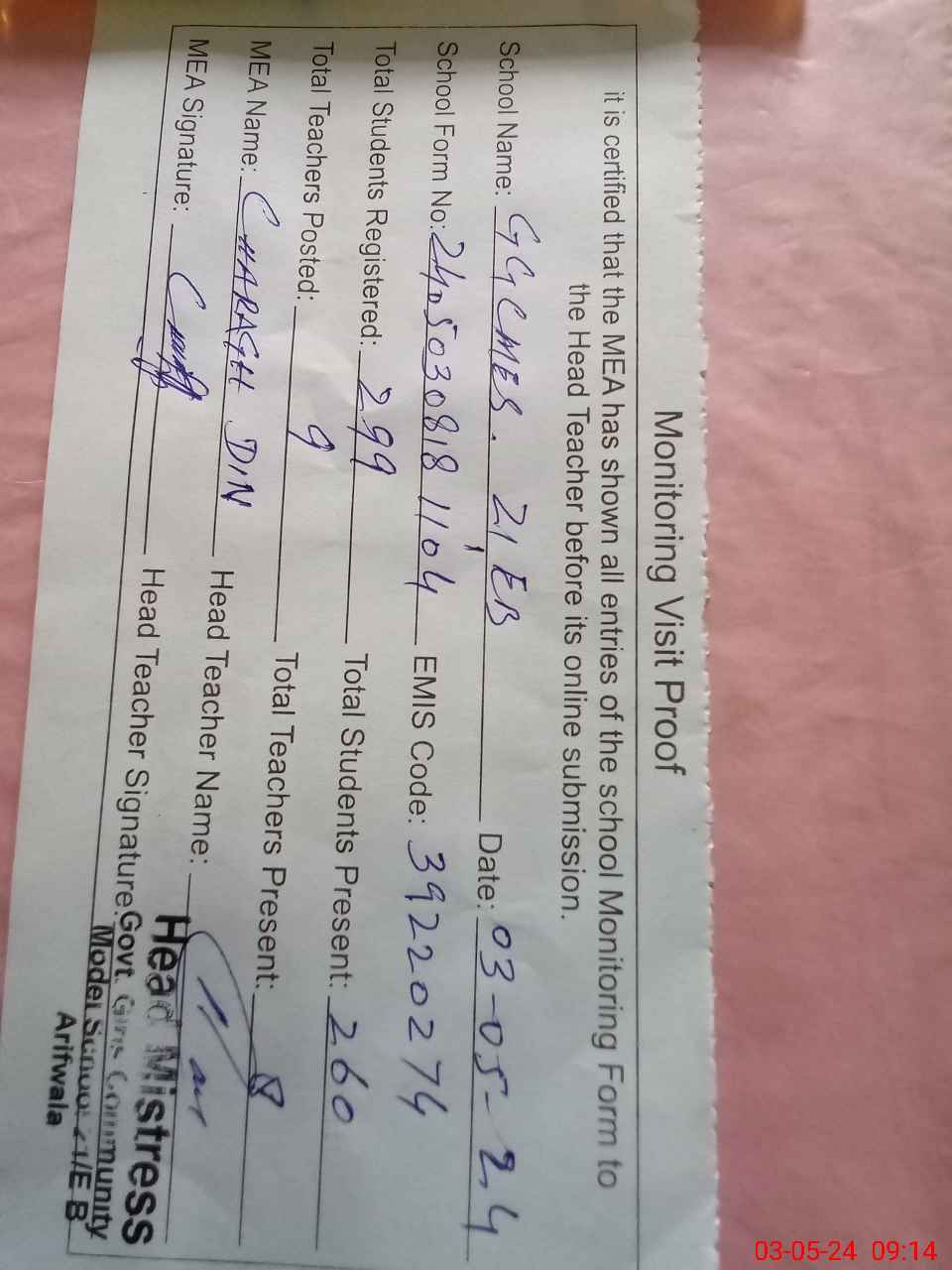 | Certified that this School was Inspected by the Undersigned MEA/DMO Today and the Information Stated Above is as Per Record. | |||||
