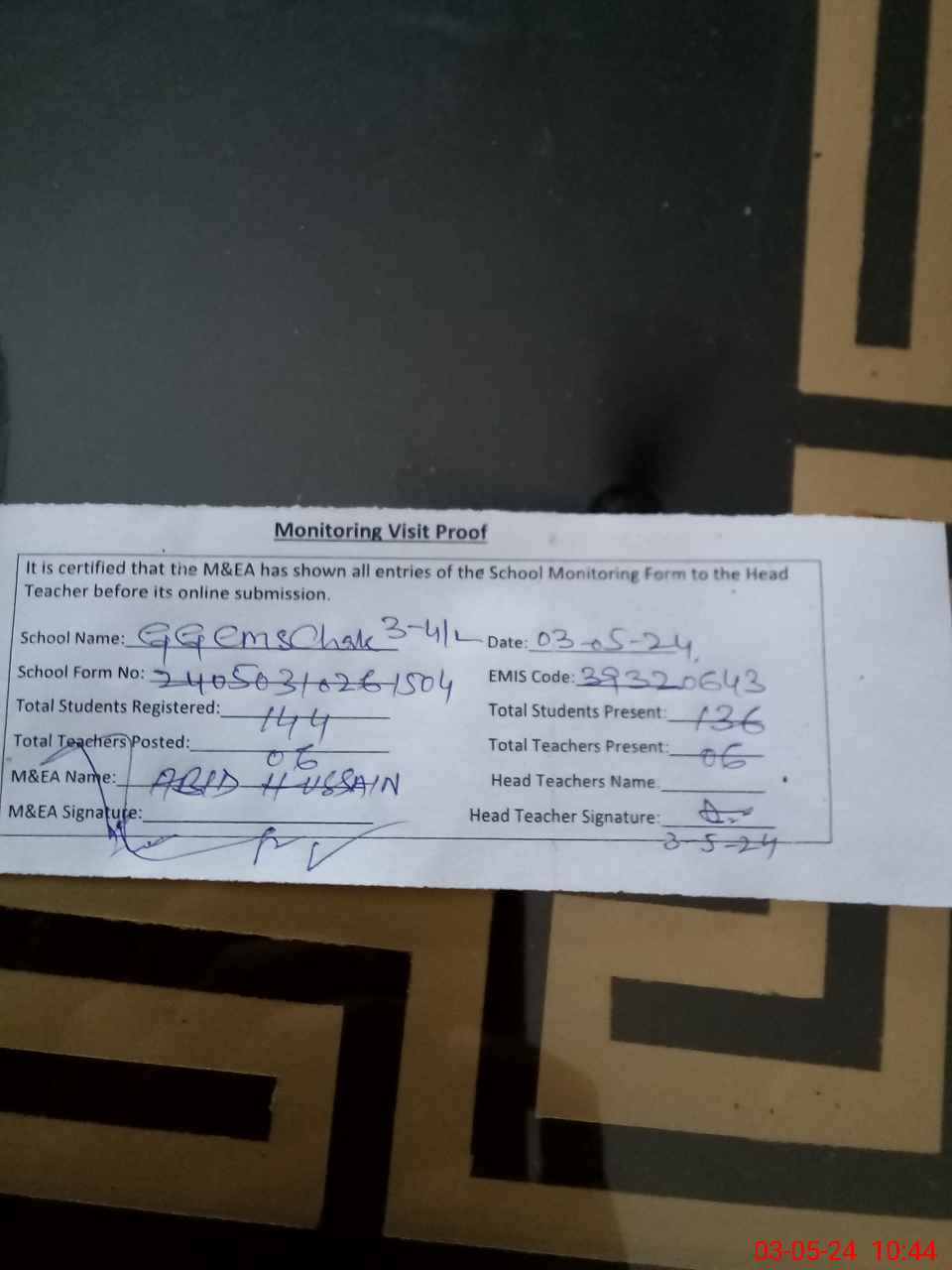 | Attendance Register | Head Teacher | MEA with School | Visit Proof |