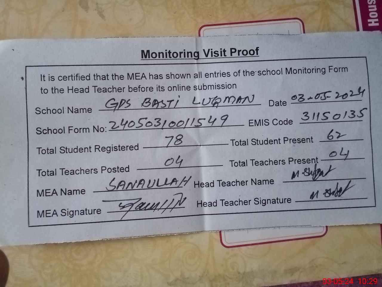 | Attendance Register | Head Teacher | MEA with School | Visit Proof |