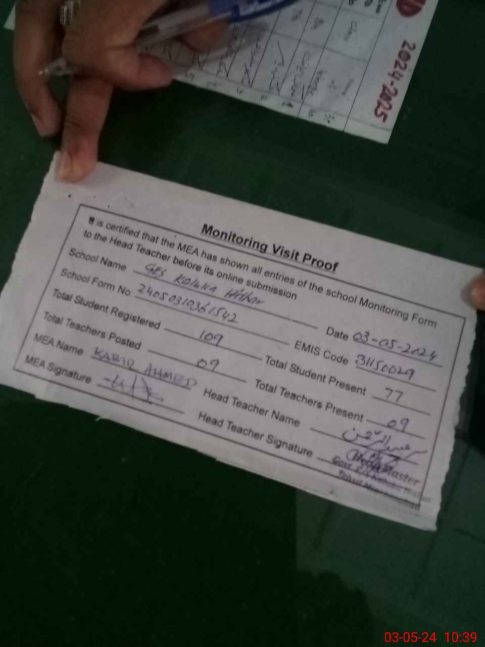 | Attendance Register | Head Teacher | MEA with School | Visit Proof |