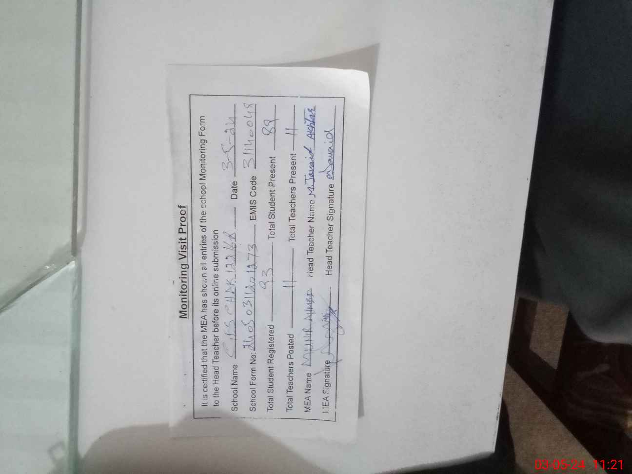 | Attendance Register | Head Teacher | MEA with School | Visit Proof |