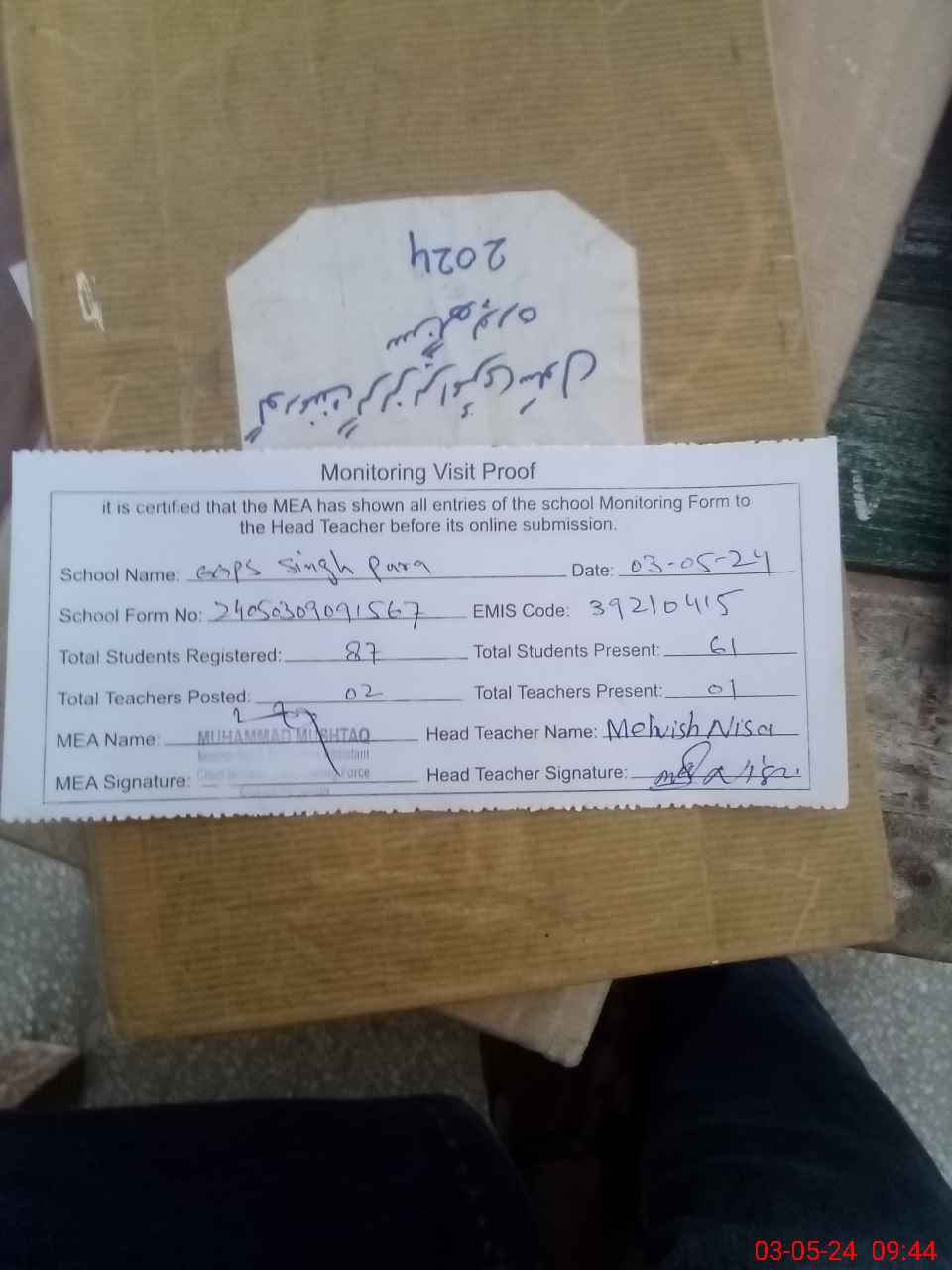 | Attendance Register | Head Teacher | MEA with School | Visit Proof |