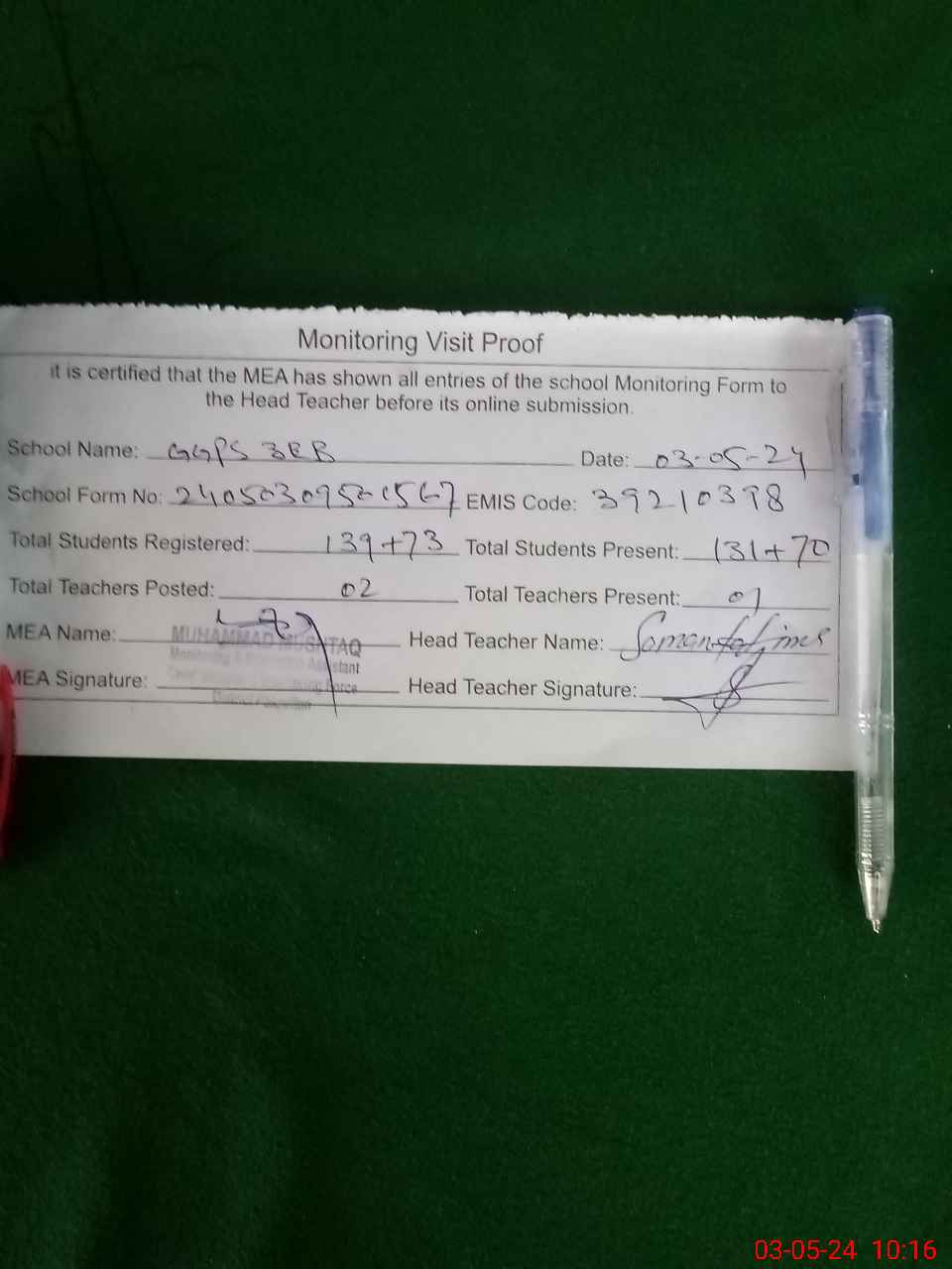 | Attendance Register | Head Teacher | MEA with School | Visit Proof |
