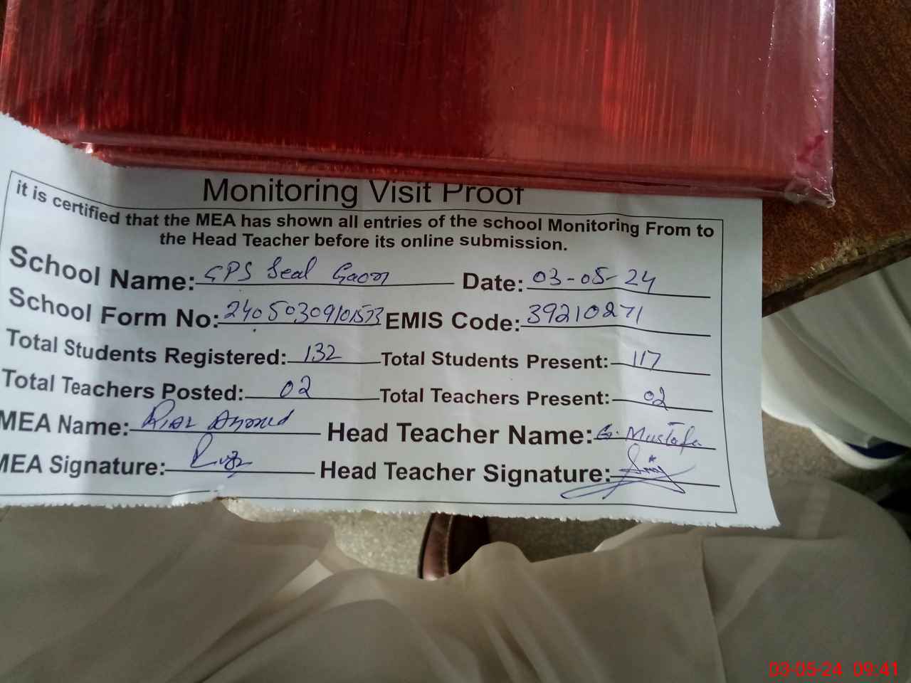 | Attendance Register | Head Teacher | MEA with School | Visit Proof |