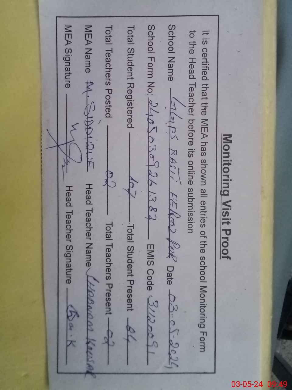 | Certified that this School was Inspected by the Undersigned MEA/DMO Today and the Information Stated Above is as Per Record. | |||||