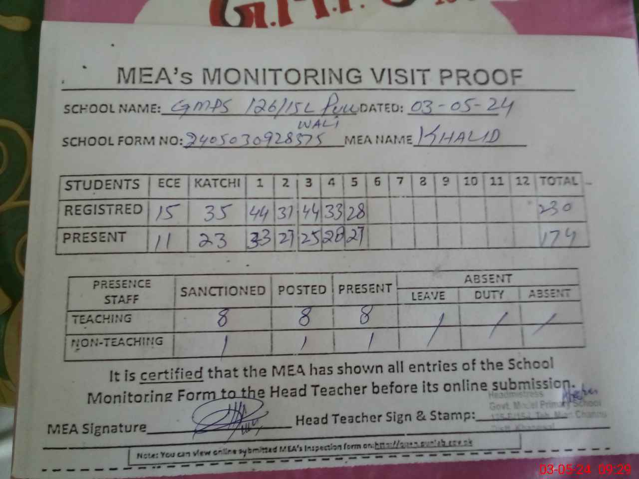 | EMIS Code: 36430284 | Name of School: GMPS 126/15-L PULL WALI, MIAN CHANNU | |||
