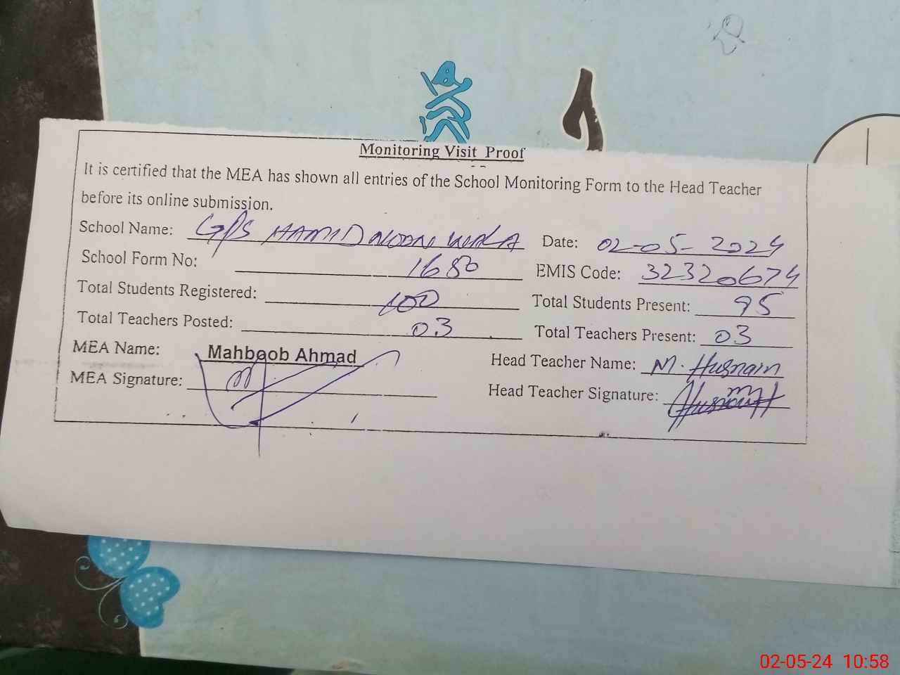 | EMIS Code: 32320674 | Name of School: GPS HAMID NOON WALA | |||