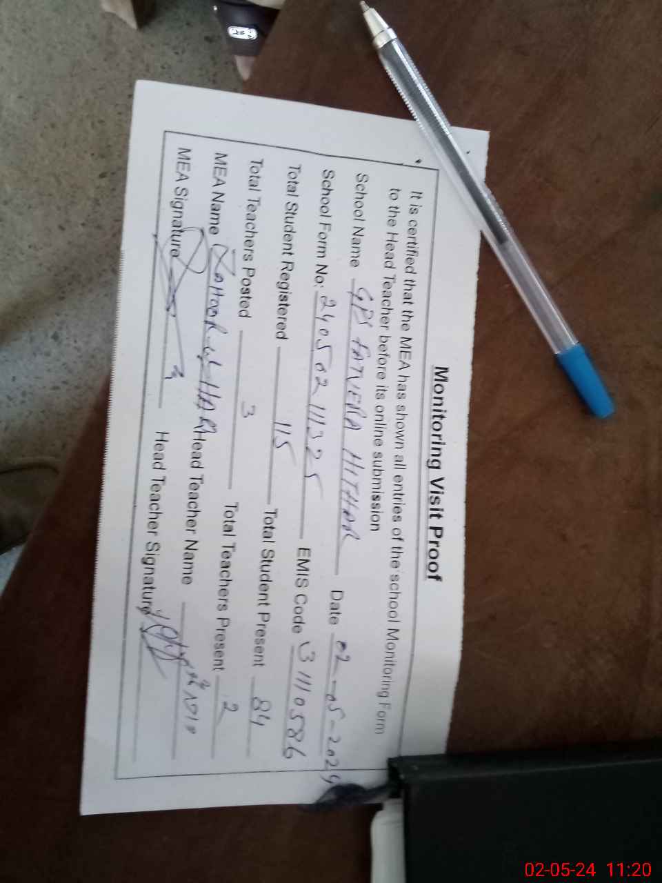 | Attendance Register | Head Teacher | MEA with School | Visit Proof |