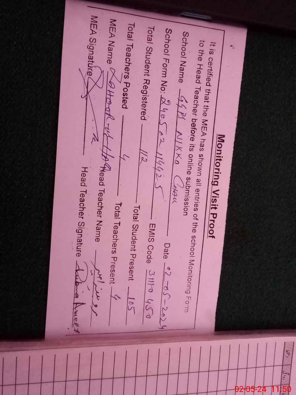 | Certified that this School was Inspected by the Undersigned MEA/DMO Today and the Information Stated Above is as Per Record. | |||||