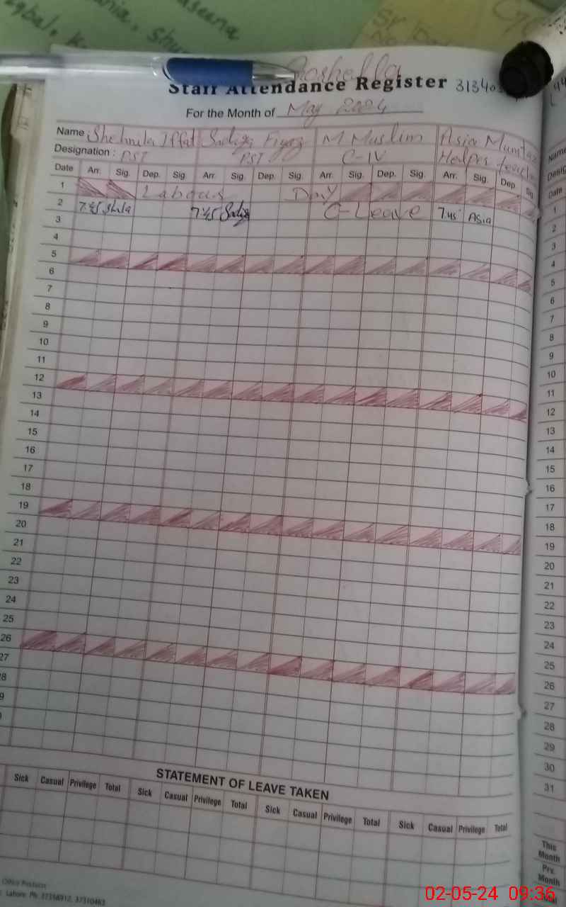 | CNIC | Full Name | Designation | R/C | Absence During Last Calender Month |