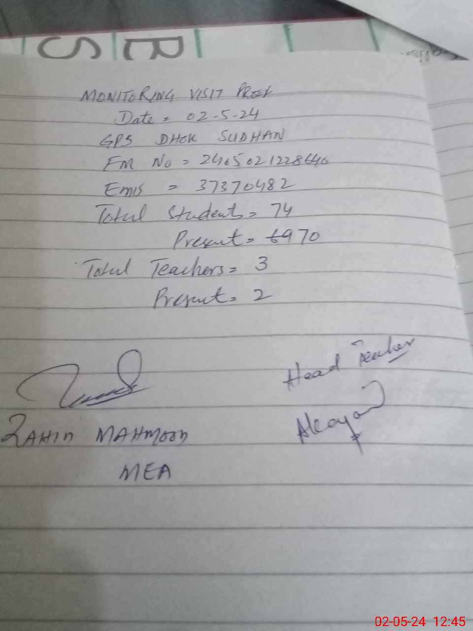| Attendance Register | Head Teacher | MEA with School | Visit Proof |