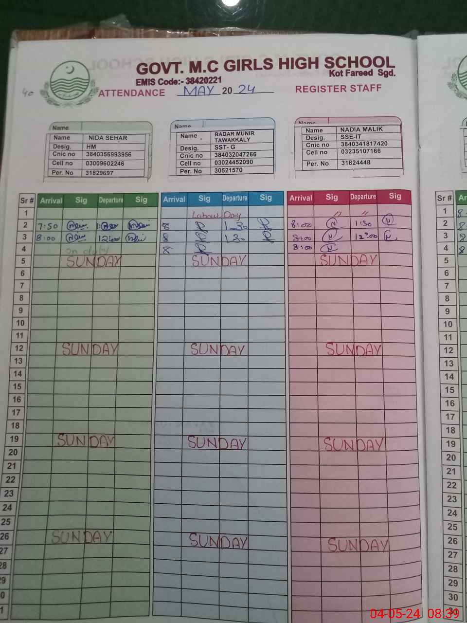 | CNIC | Full Name | Designation | R/C | Absence During Last Calender Month |