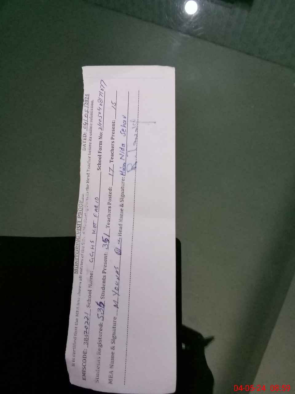 | Monitoring Date: 04-05-2024 | Start Time: 04-05-2024 08:17 AM | End Time: 04-05-2024 09:04 AM | Name of MEA: MU**** YO**** | |