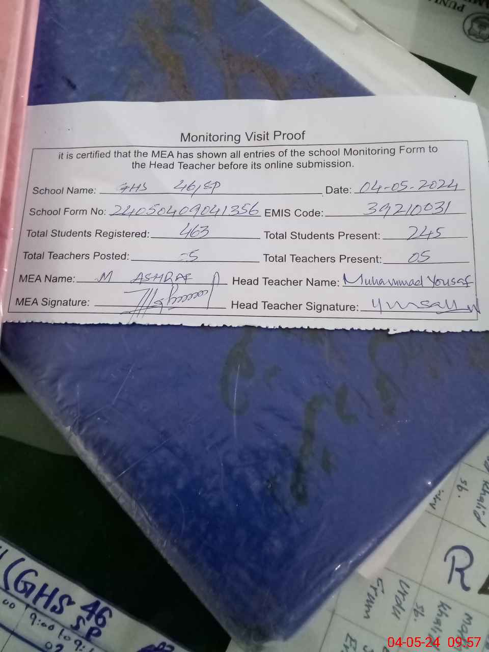 | Attendance Register | Head Teacher | MEA with School | Visit Proof |