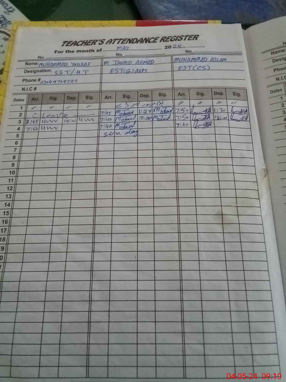 | CNIC | Full Name | Designation | R/C | Absence During Last Calender Month |