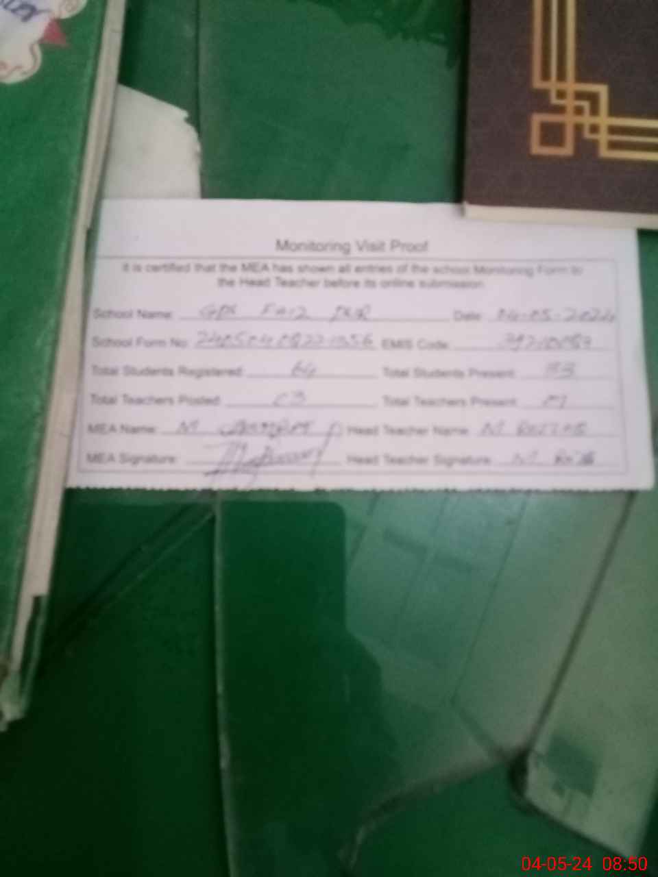 | Attendance Register | Head Teacher | MEA with School | Visit Proof |