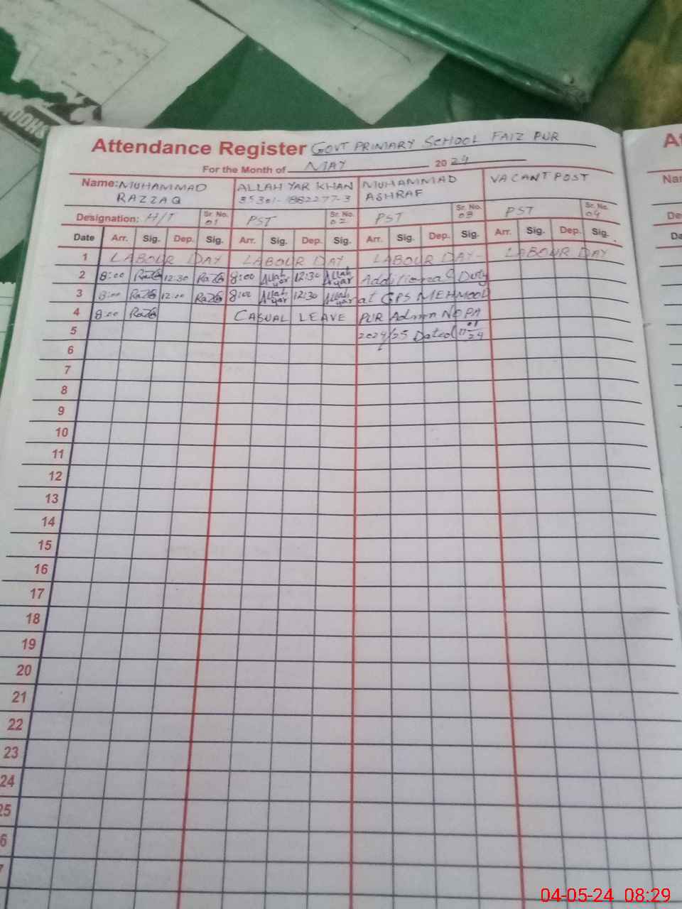 | CNIC | Full Name | Designation | R/C | Absence During Last Calender Month |