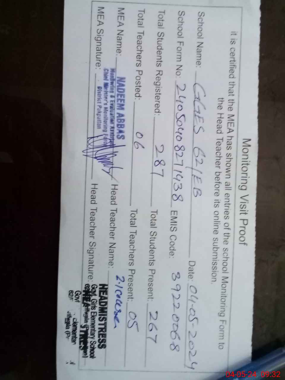 | Name: MA**** IQ**** Designation: (School Headmaster's/Headmistress's) EST Phone/Cell Number: 03**** |