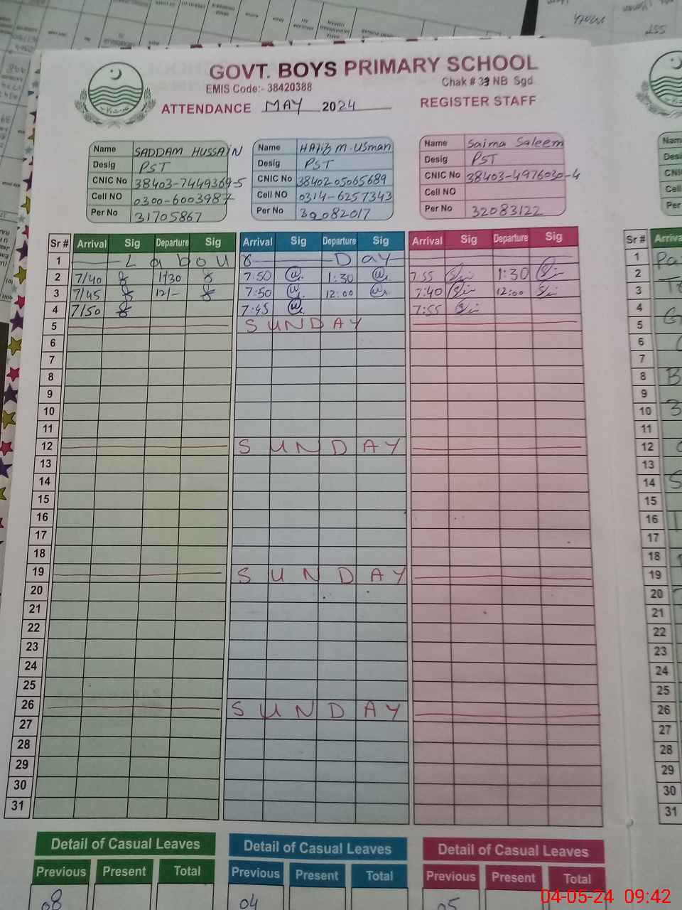 | CNIC | Full Name | Designation | R/C | Absence During Last Calender Month |