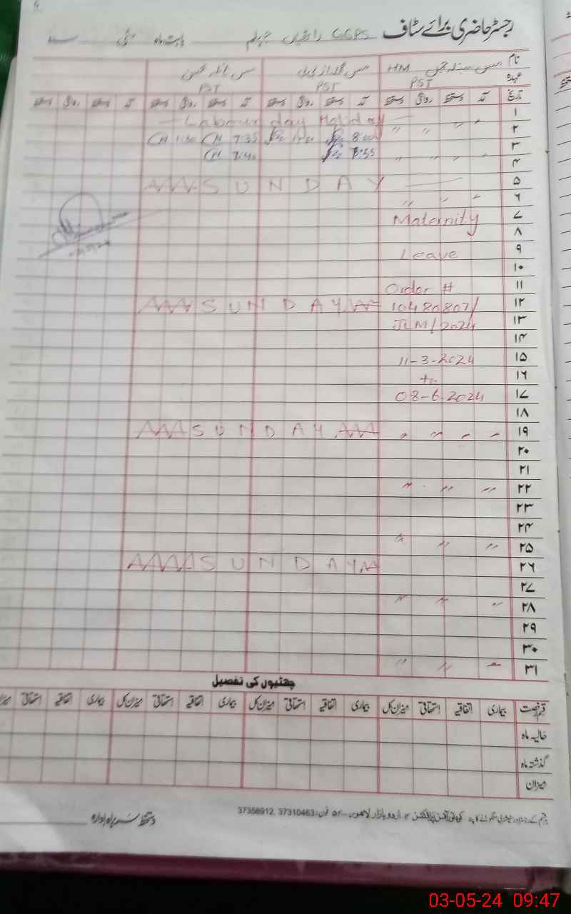 | CNIC | Full Name | Designation | R/C | Absence During Last Calender Month |