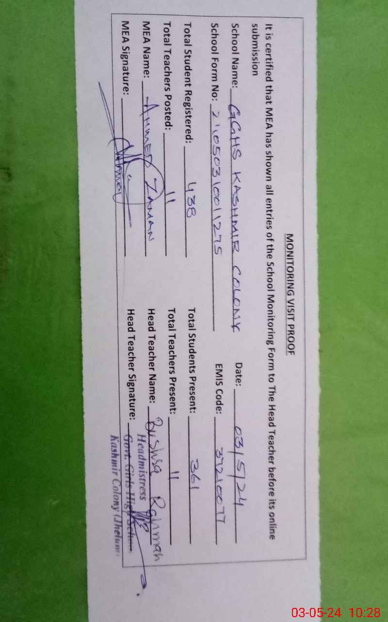 | EMIS Code: 37210077 | Name of School: GGHS KASHMIR COLONY | |||