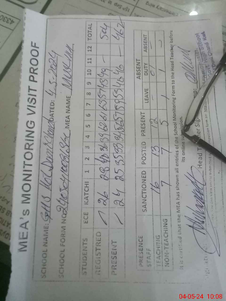 | Attendance Register | Head Teacher | MEA with School | Visit Proof |