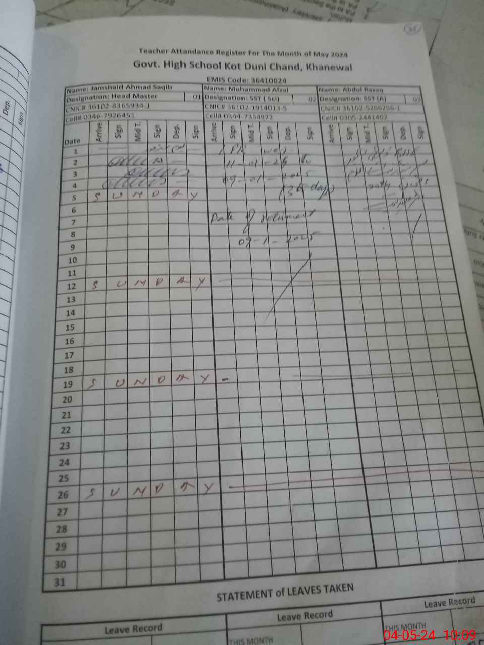 | 36**** | Ab**** Ra**** | 5 | 1 | 0 | 0 | 0 | 0 | 0 | 0 | 0 | 0 | 0 | Exam Duty |