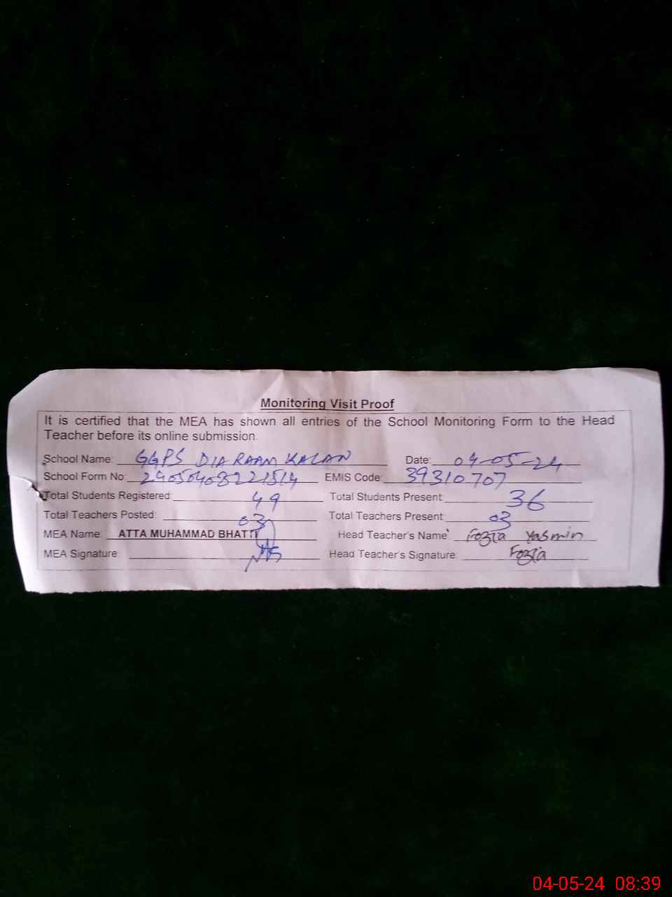 | Certified that this School was Inspected by the Undersigned MEA/DMO Today and the Information Stated Above is as Per Record. | |||||