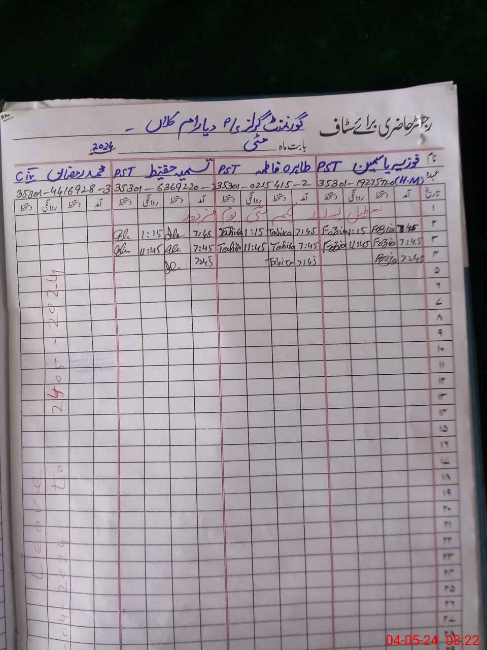 | CNIC | Full Name | Designation | R/C | Absence During Last Calender Month |