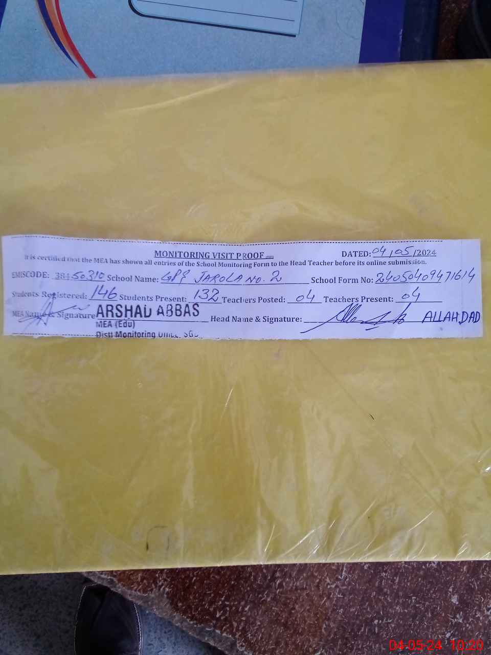 | Attendance Register | Head Teacher | MEA with School | Visit Proof |