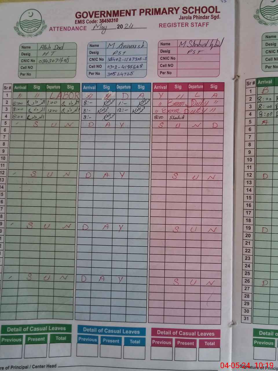 | CNIC | Full Name | Designation | R/C | Absence During Last Calender Month |