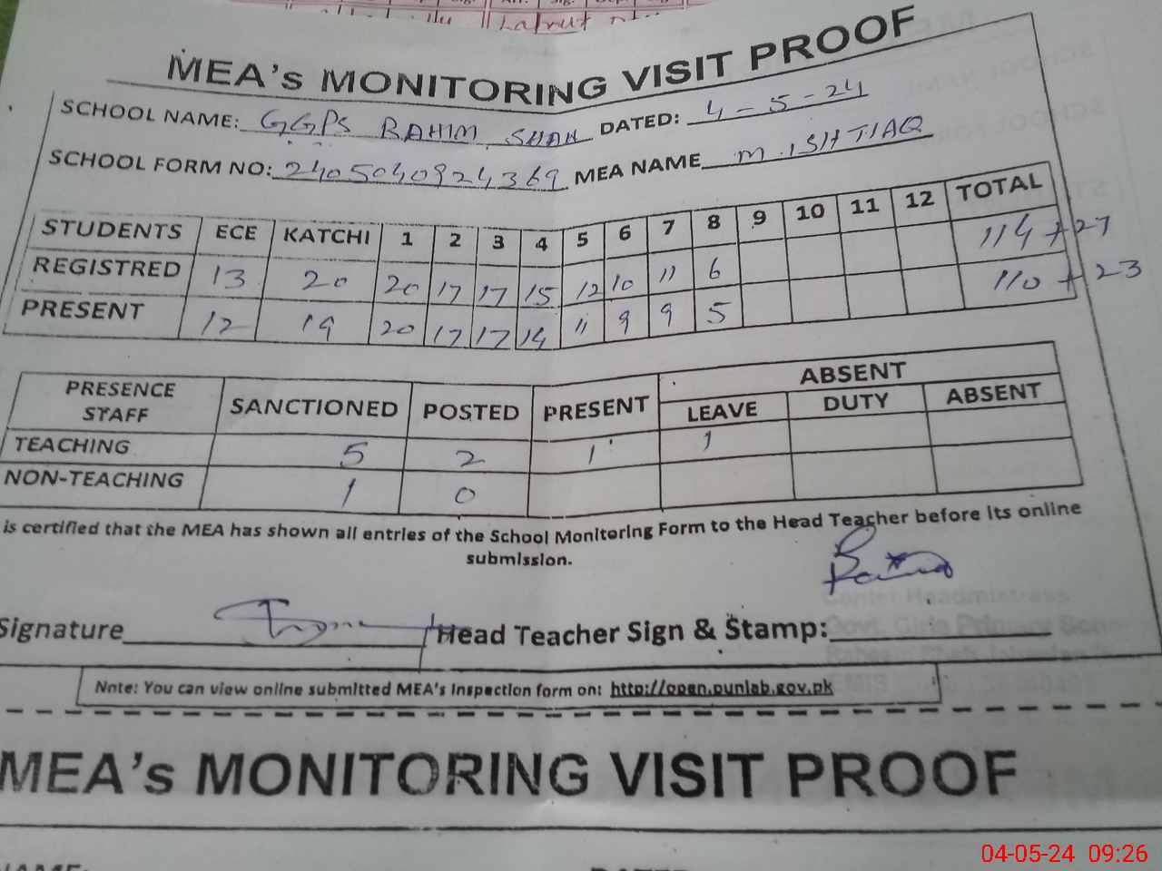 | Attendance Register | Head Teacher | MEA with School | Visit Proof |