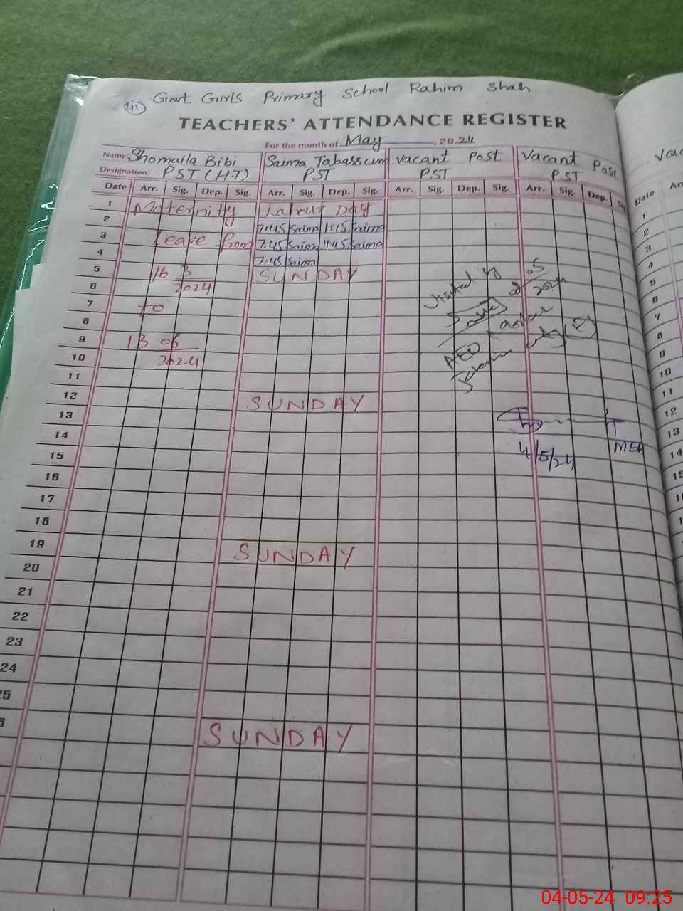 | Leave | Duty | Absent | Maternity | Medical | Ex- Pak |