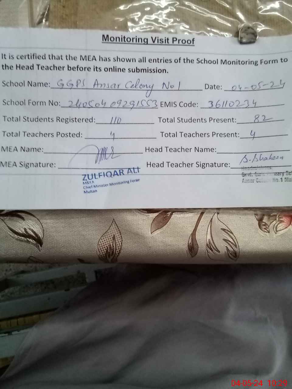 | EMIS Code: 36110234 | Name of School: GGPS ANSAR COLONY NO.1 MULTAN | |||
