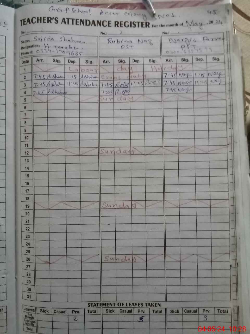 | Leave | Duty | Absent | Maternity | Medical | Ex- Pak |