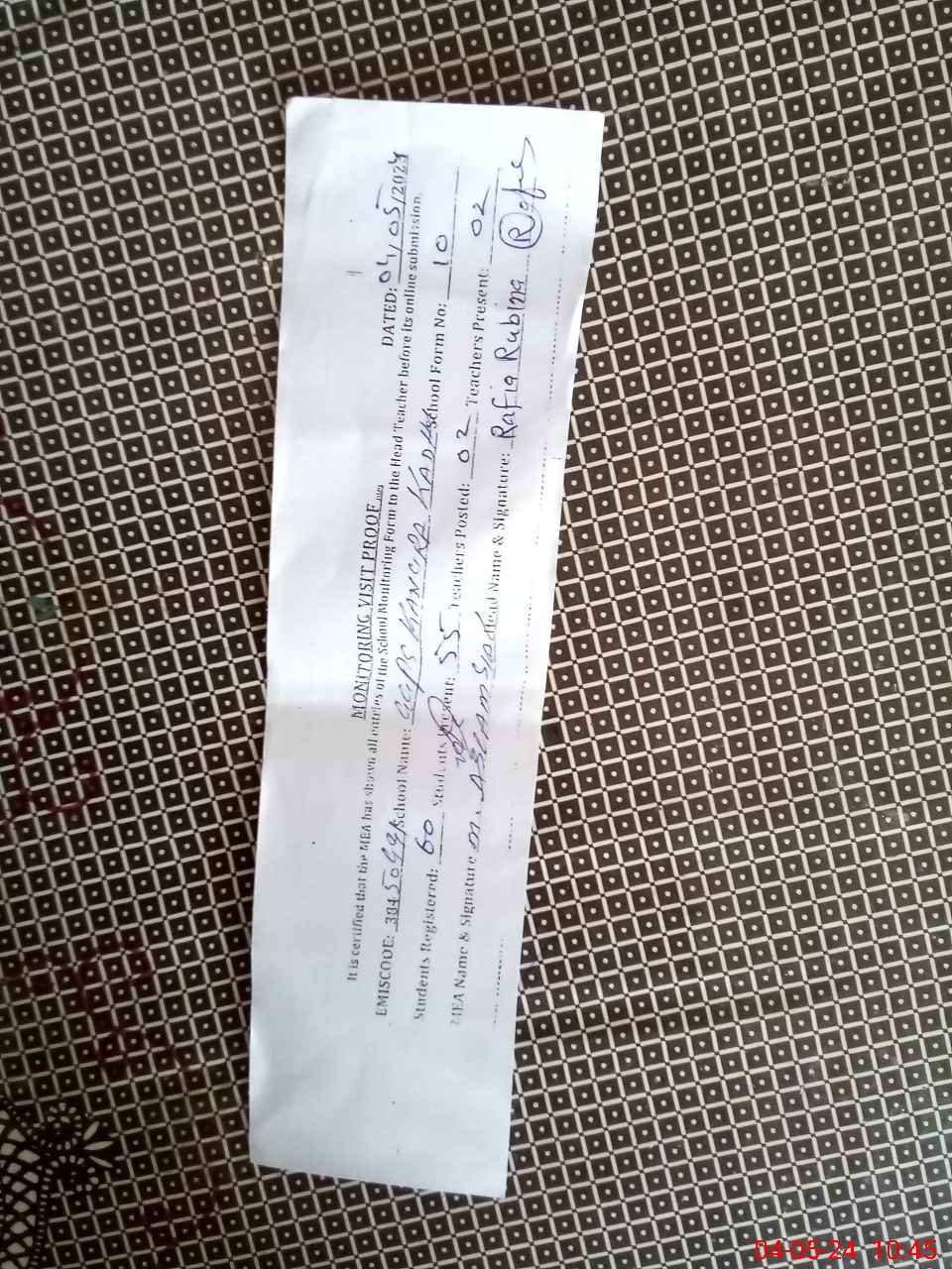 | Name: RA**** RU**** Designation: (School Headmaster's/Headmistress's) PTC/JV Phone/Cell Number: 03**** |