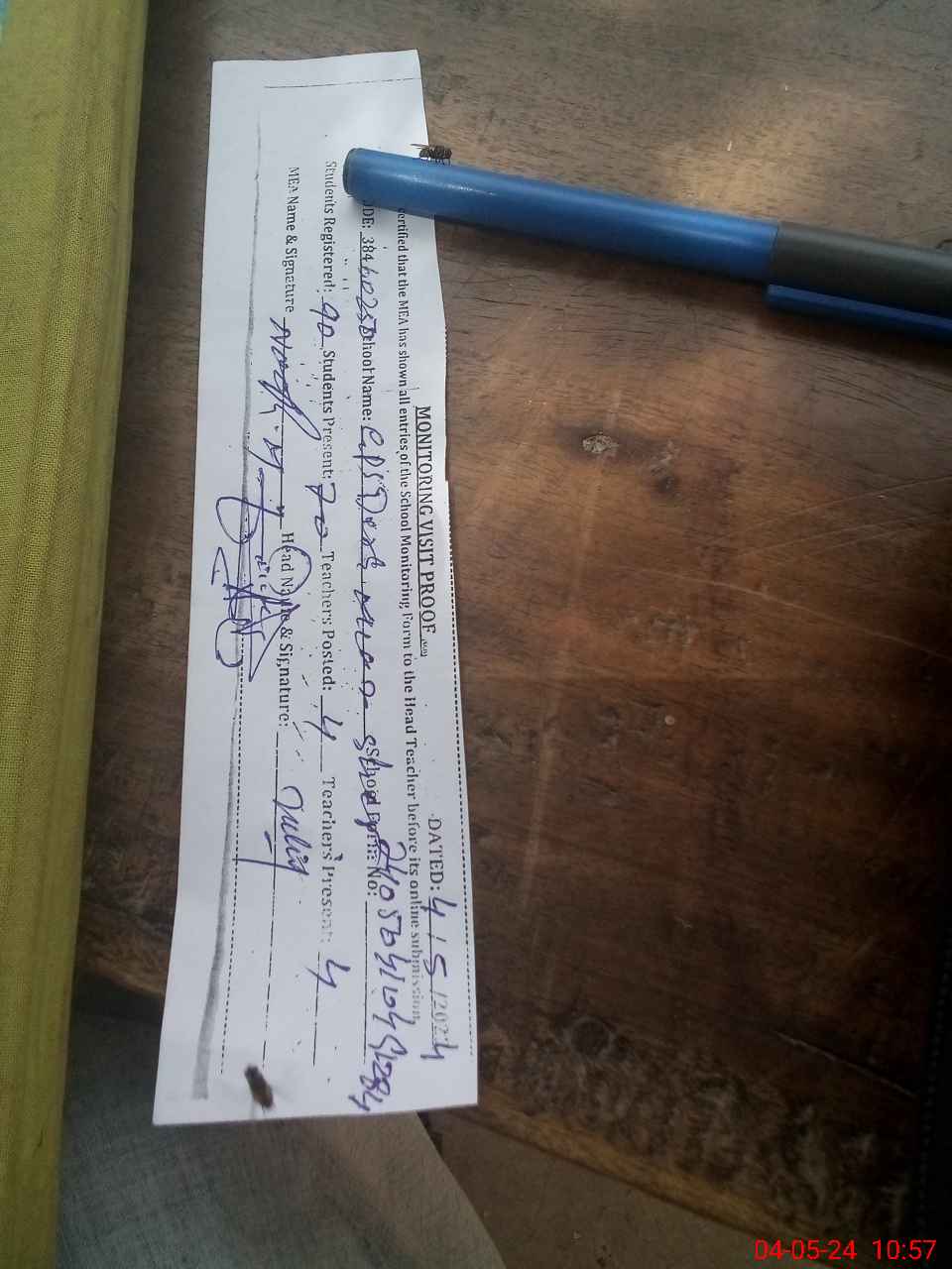 | Attendance Register | Head Teacher | MEA with School | Visit Proof |
