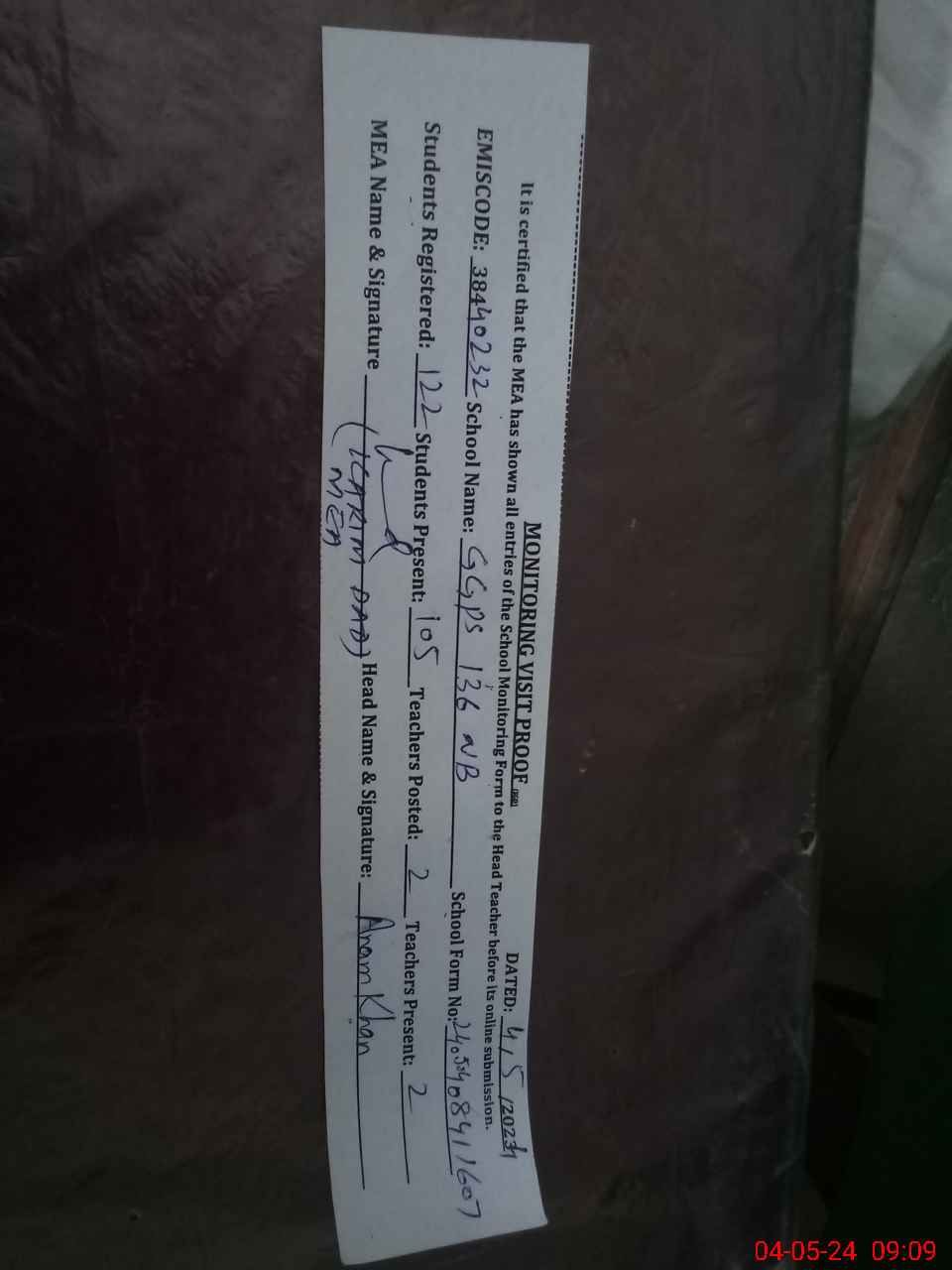 | Attendance Register | Head Teacher | MEA with School | Visit Proof |
